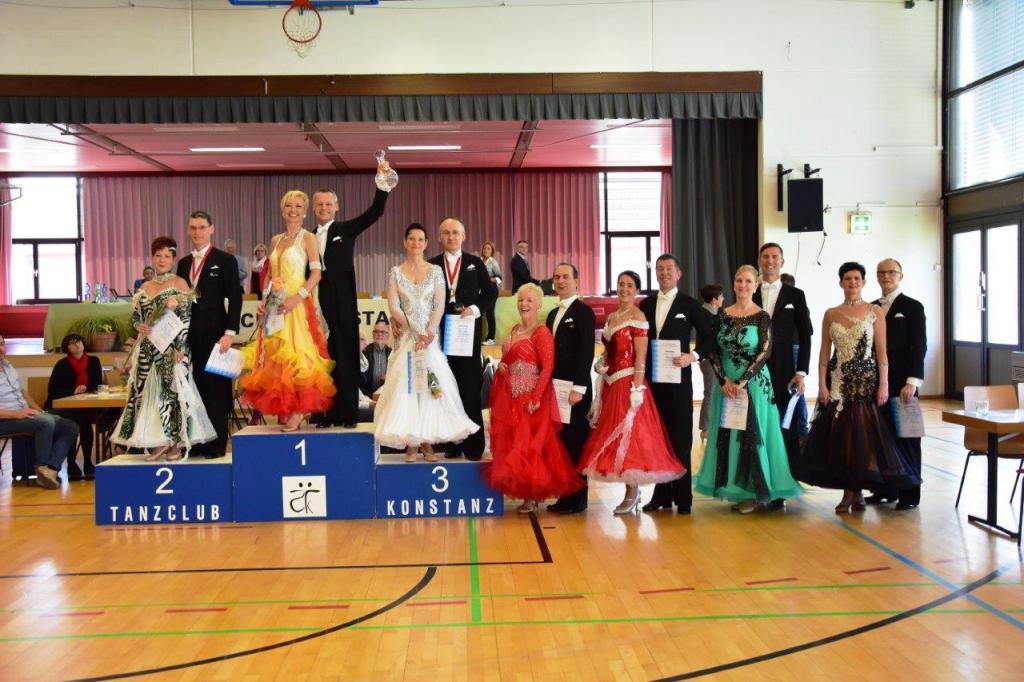 Am Samstag, den 1. April wurde mit 13 Paaren in der Senioren III S Standard das größte Turnier des Tanzfestes in Konstanz-Dettingen ausgerichtet. Mit am Start auch die Reutlinger Tänzer Dieter und Annette Kuchenbecker, die bereits ab dem ersten Tanz die Wertungsrichter begeisterten. Im Finale lieferten sich die beiden ein Kopf an Kopf Rennen mit dem zweit-platzierten Paar. Letztendlich konnten die Reutlinger den Langsamen Walzer, Wiener Walzer, Slow Fox und Quickstepp für sich entscheiden und mussten nur den Tango abgeben. Verdient ertanzte sich das Paar somit den ersten Platz und konnte sich über den Pokal, den sogenannten "Ehrenpreis der Stadt Konstanz", eine gläserne Dekantier-Karaffe mit Gravur, freuen.Gleich am folgenden Tag starteten Dieter und Annette erneut in der Senioren III S Standard, dieses Mal im österreichischen Höchst. Gegen die neun anderen Paare konnten sich die Reutlinger klar durchsetzen und siegten im Finale in allen fünf Tänzen.