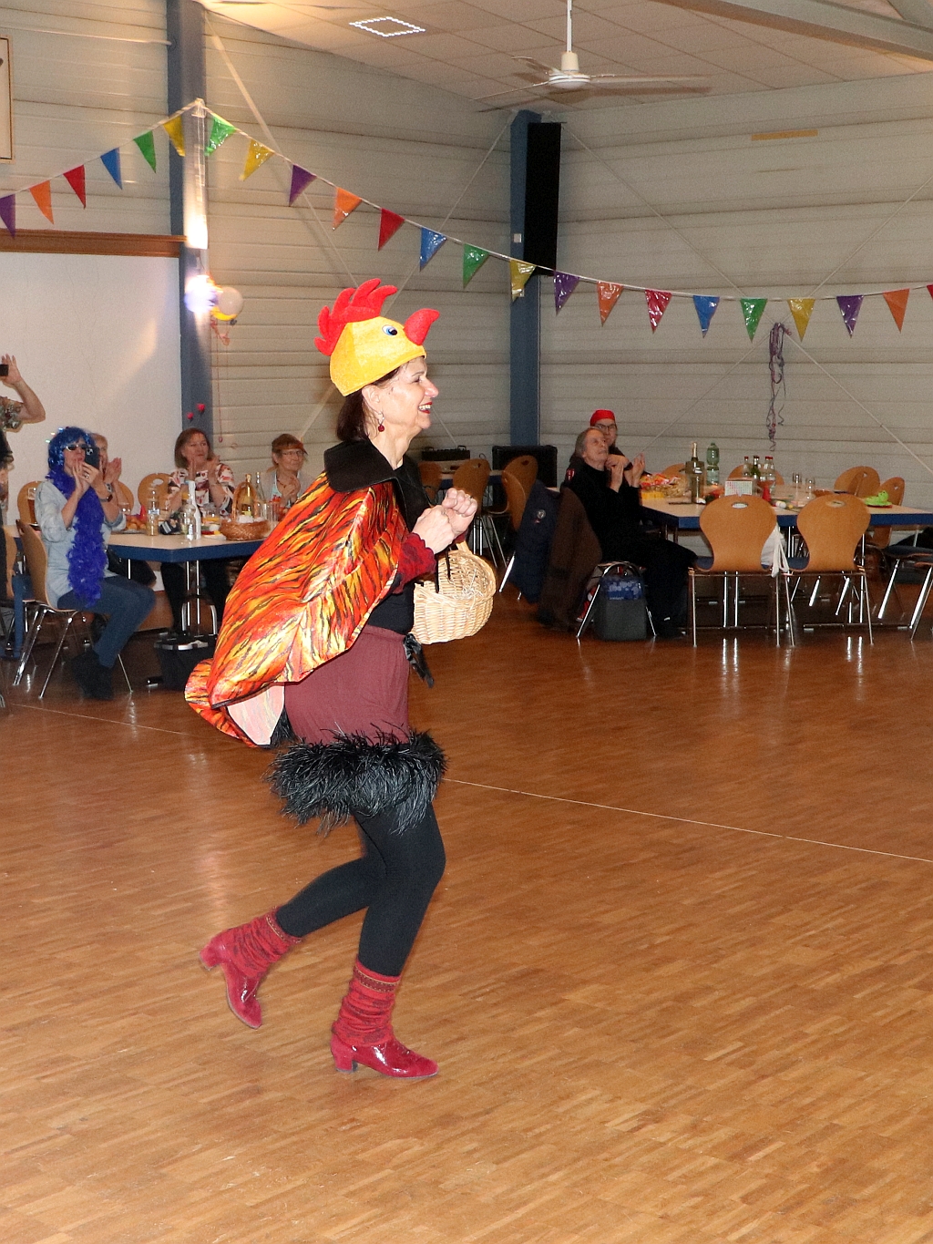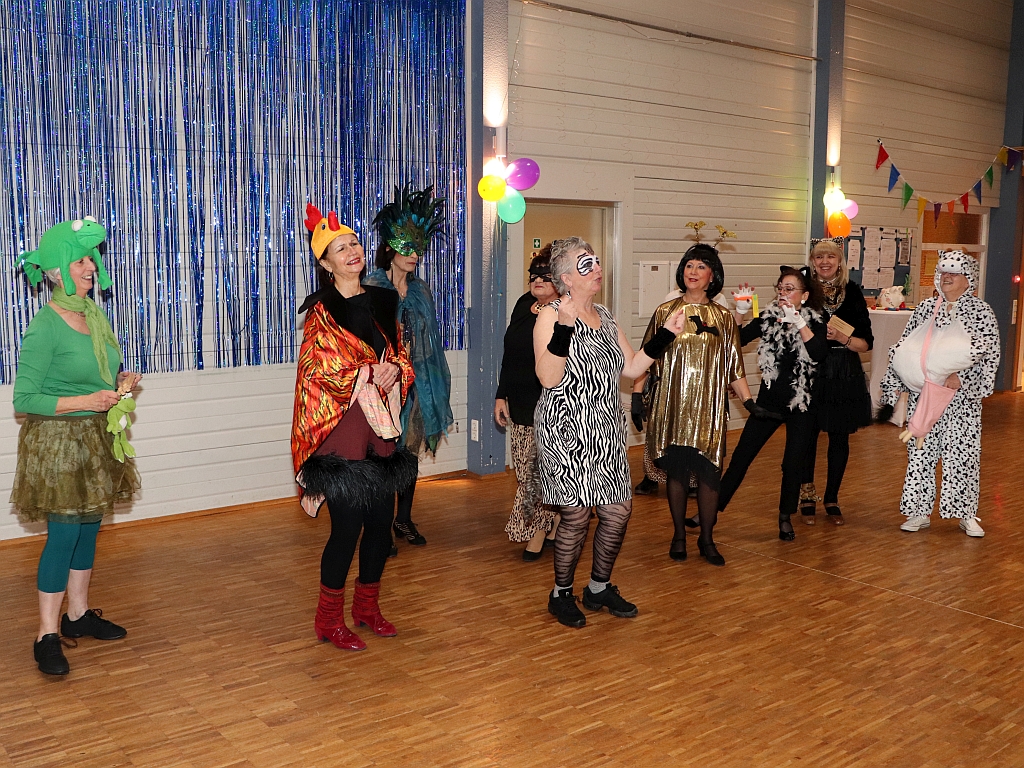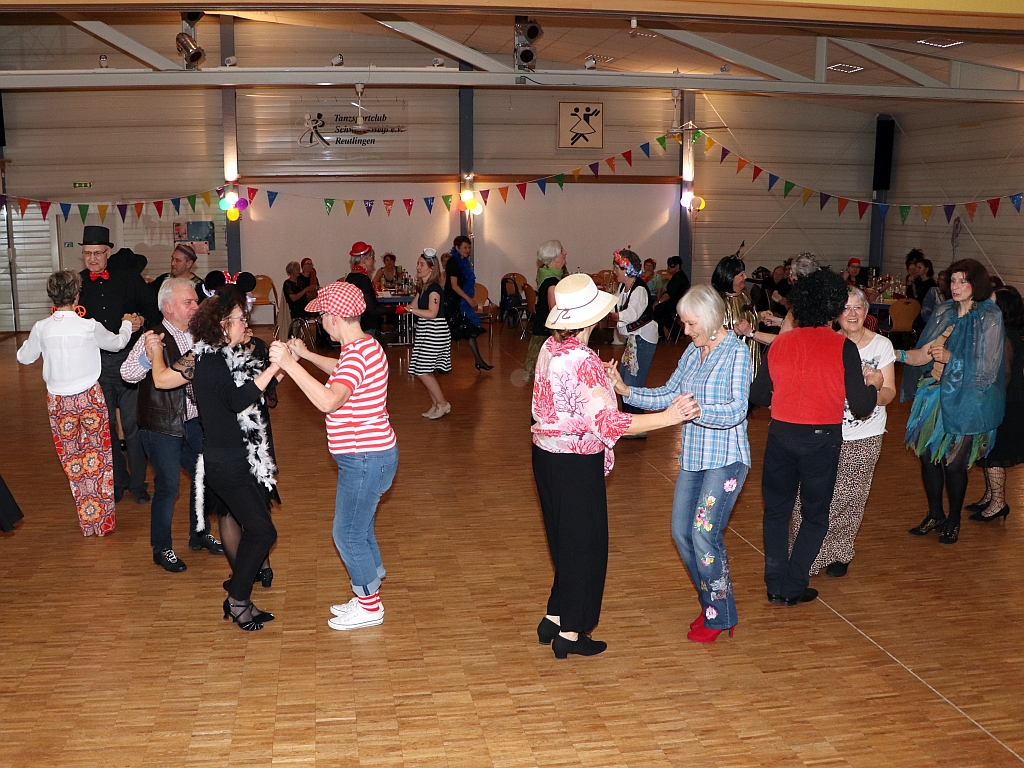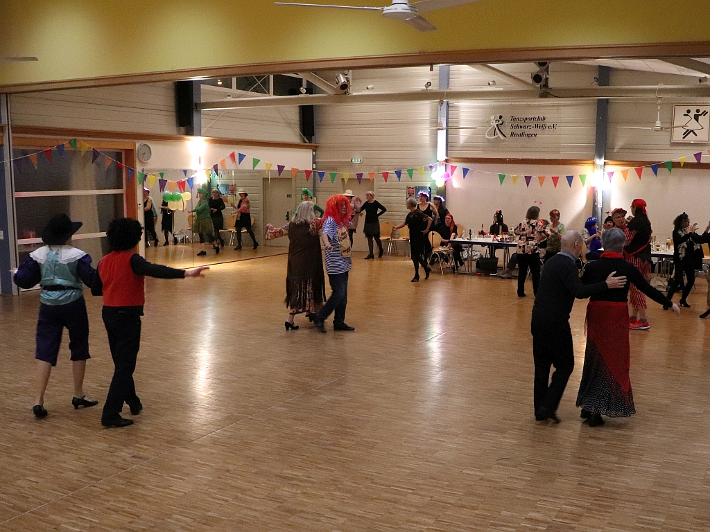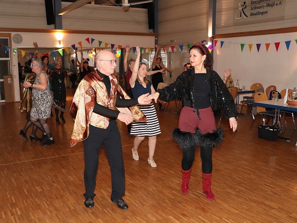 In Erwartung der Partygäste wurde das Tanzsportcentrum des Tanzsportclubs Schwarz-Weiß Reutlingen auch in diesem Jahr wieder in Fasnet-Atmosphäre versetzt. Zu Beginn des Tanzabends entführten die Modern Line Dancerinnen des TSV Frickenhausen in die Tierwelt. Sie überraschten die Faschingsgesellschaft mit einem Einmarsch der närrischen Tierschau: Die Tänzerinnen waren in Tierkostüme verkleidet, darunter ein Huhn, und brachten ihre gelegten Eier mit, die sie an die Gäste verteilten.