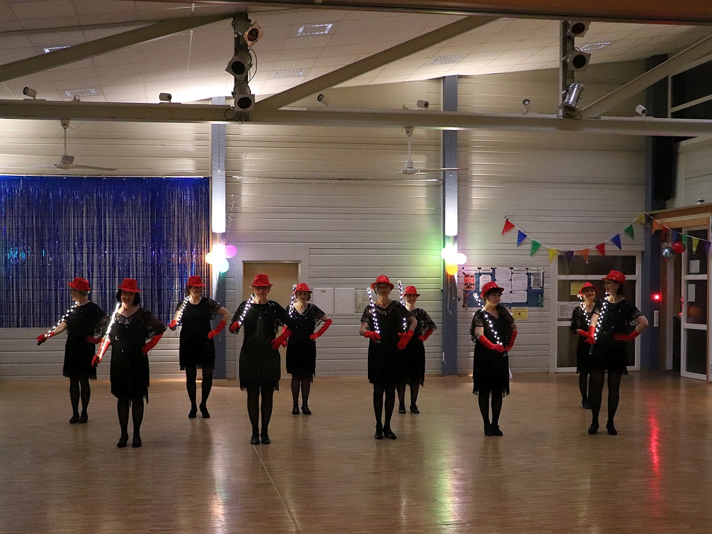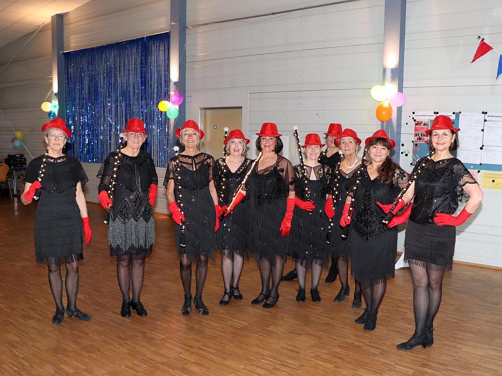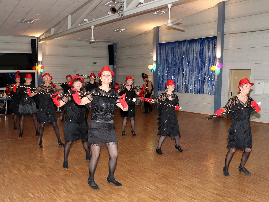Nach einer Tanzrunde starteten die Line Dance-Raketen des TC SW RT den QuickStep „völlig losgelöst von der Erde“ mit beleuchteten Tanzstöcken. Wenig später tanzte die Gruppe, unter ihnen Frickenhäuser Tänzerinnen von Lady Solo, auf einen Bigband-Titel aus dem Swing-Jazz-Genre. Auch dieser Swing-Tanz wurde mit viel Beifall belohnt.