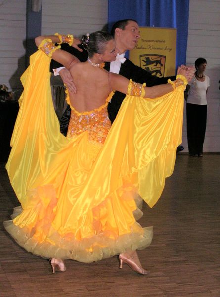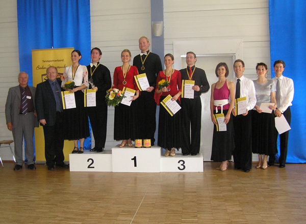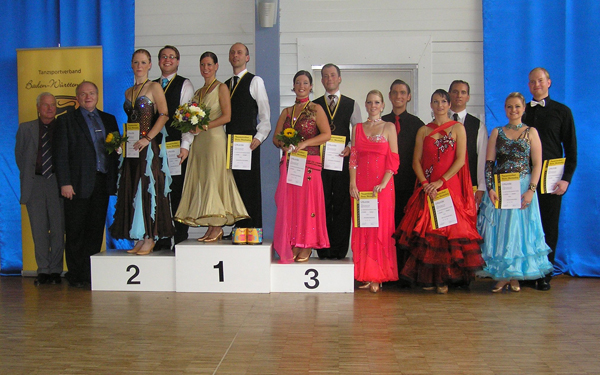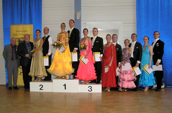 Vom 12. Bis 13.09. begrüßte der TC Schwarz-Weiß Reutlingen über 90 Paare aus ganz Baden-Württemberg zu den Landesmeisterschaften in den Standardtänzen. Hierzu durfte der Verein hochrangige Funktionäre des Deutschen und des Baden-Württembergischen Tanzsportverbandes, wie den Landessportwart Volker Günther, begrüßen.Am Samstag startete die Altersklasse der Senioren III (ab 55 J.) mit 50 Paaren in fünf Leistungsklassen unter der Turnierleitung von Helga Greiner und dem kritischen Blick des Landestrainers Klaus Bucher. In der höchsten Klasse, der Sonderklasse, ertanzten sich Peter und Monika Neumaier vom TC Schwarz-Weiß Reutlingen einen achtbaren 12. Platz bei 27 teilnehmenden Paaren. Landesmeister wurde das Paar Rainer und Rosita Aust aus Weinheim.Den Abschluss des Turnierwochenendes machten die Paare der Altersklasse Hauptgruppe II (ab 28 J.). Unter den Augen von Landestrainerin Dagmar Beck gingen über 40 Paare in fünf Leistungsklassen unter der Turnierleitung von Thomas Czinczoll auf die Jagd nach dem Landesmeistertitel. An dieser Jagd beteiligten sich auch drei Reutlinger Paare in den beiden höchsten Klassen (A und S) mit großem Erfolg. In der A-Klasse (zweithöchste Klasse) ertanzte sich das Paar Helge Lamnek/Sonja Groß die Bronzemedaille. Gold ging an das Paar Lang/Litzenberger aus Freiburg. In der S-Klasse (höchste Klasse) ertanzte sich unser Paar Gintautas Bulotas/Julia Patzelt bei ihrem ersten gemeinsamen Turnier ebenfalls die Bronzemedaille. Das Siegerpaar Petsch kam aus Pforzheim.Insgesamt war das Vereinsheim des TC Schwarz-Weiß Reutlingen an diesem Wochenende super besucht und freute sich über eine Rekordteilnahme an startenden Paaren und Fans aus dem ganzen Land.