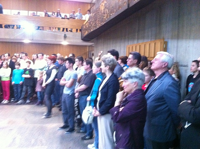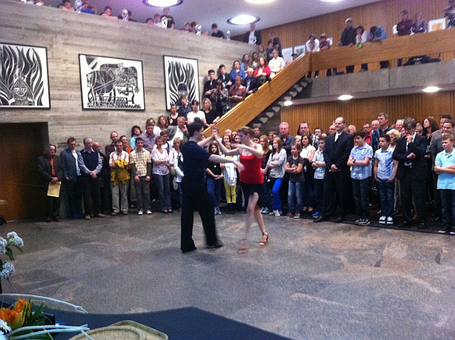 Unserem Verein wurde in diesem Jahr die Gelegenheit geboten, sich bei der Ehrungsfeier zu präsentieren. Mit einer kurzen PowerPoint-Präsentation informierte unser Öffentlichkeitsreferent Franz Tesch zuerst über unseren Verein bevor Markus Vogel und Silke Weinmann einige Kostproben ihres Könnens in den Lateintänzen Jive und Rumba zeigten. Sie wurden dabei von ihrem Trainer Alexander Engel unterstützt, der dem sehr interessierten Publikum Erläuterungen gab und nicht versäumte Werbung für unseren Verein zu machen. Die Vorführung kam gut an und es gab am Ende begeisterten Applaus.