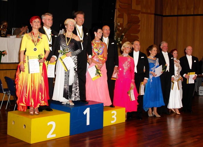 in der Senioren S IV Standard Klasse waren 13 Paare am Start und kämpften um den Titel des Landesmeisters. Das Reutlinger Turnierpaar Heinz und Margret Cierpka vom Tanzsportclub Schwarz-Weiß Reutlingen überzeugten mit einer überragenden Leistung, Elegance und tänzerischem Können. Bereits in der Vorrunde war abzusehen, Cierpka´s gehören ins Finale, so Rolandos Trembo Trainer des Reutlinger Turnierpaares. Diese Meinung wurde durch die Wertungsrichter wieder- gespiegelt. Im Finale glänzten Cierpkas durch Höchstleistung und konnten so den langsamen Walzer, Tango, Slowfox, Quickstep und den Wienerwalzer für sich entscheiden. Wenn man bedenkt, dass man in der Senioren IV Klasse mindestens 66 Jahre alt sein muss, ist es um so bewundernswerter, wie flott und mit welcher Leichtigkeit auch hier die Paare hochklassiges Tanzen aufzeigten. Am Ende zeigten die Wertungsrichter das Traumresultat - 30 Mal die Bestnote eins. Damit sicherte sich das Reutlinger Turnierpaar ungefährdet den Landesmeister in der Senioren S IV Standardklasse. Es ist schon fast unheimlich, wie gut die beiden derzeit tanzen, freuten sich die begeisterten Schlachtenbummler des TC Schwarz-Weiß Reutlingen, die extra nach Kirchheim/Teck angereist waren um „ihre“ Cierpkas anzufeuern. Platz zwei ging an Jürgen und Friederike Ensslin vom TSC Astoria Stuttgart und der dritte Platz ertanzte sich das Paar Gerhard und Borghild Delvendahl vom Markgräfler Tanzsport Club.Heinz Klein