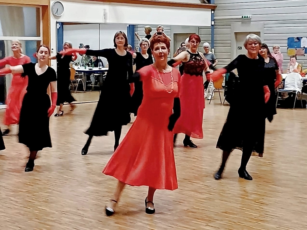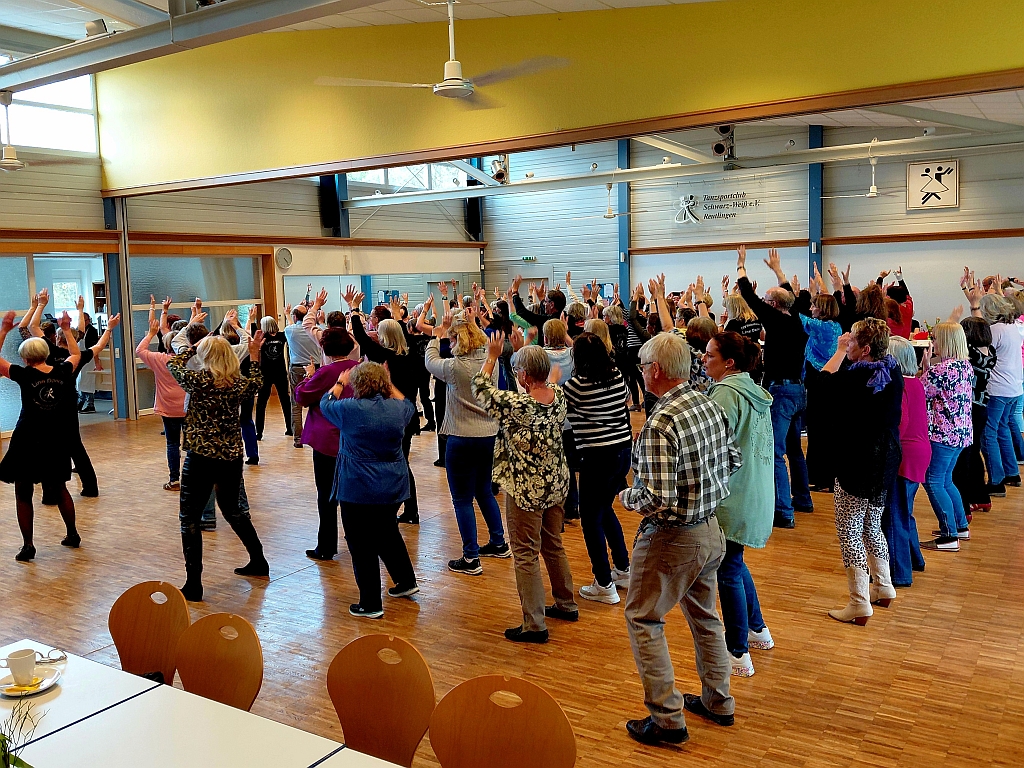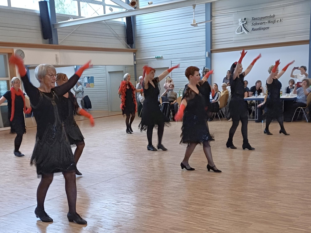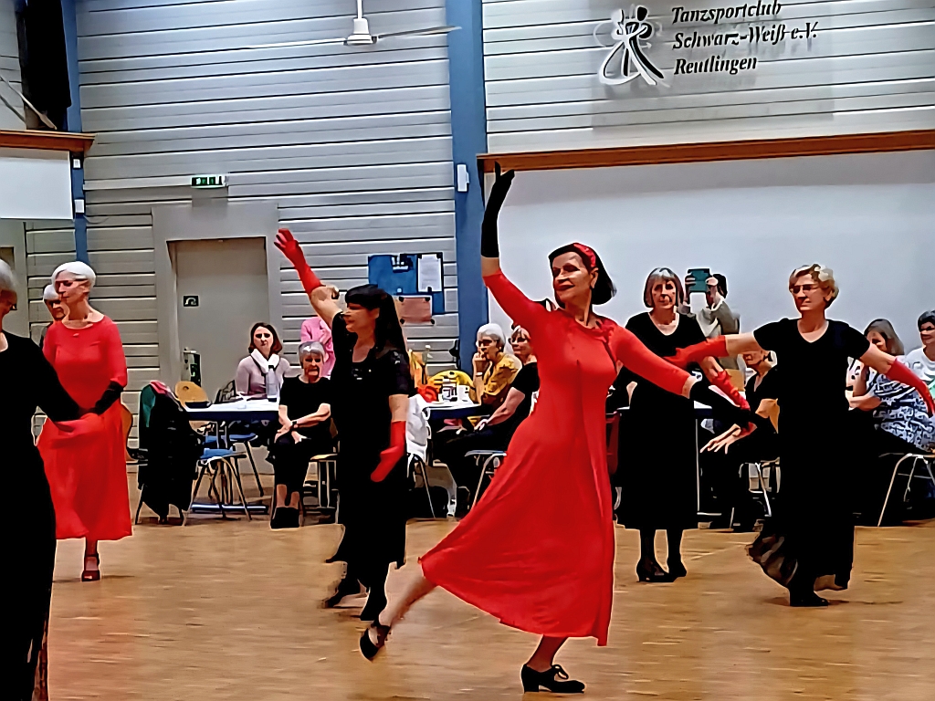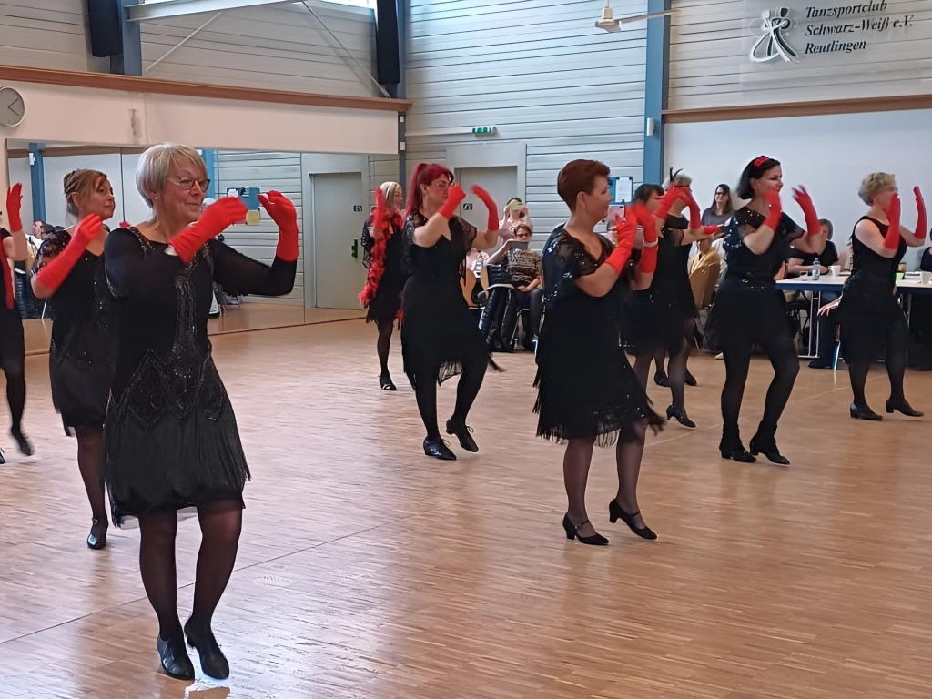 Auch in diesem Jahr konnten sich die Modern Line Dancerinnen wieder auf ihre Party freuen, die am Samstag, 21. März 2026, im Tanzsportcentrum Schwarz-Weiß Reutlingen stattfand. Bei Kaffee und selbstgebackenen Kuchenspezialitäten erfreuten sich die zahlreichen Gäste an Tanzvorführungen und wurden selbst aktiv beim vielfältigen Tanzangebot! Um 16:00 Uhr eröffnete Barbara Bader die Party und kündigte das Opening der TC-Showtanzgruppe an, die ein Latein-Medley aufs Parkett legte. Tanzsporttrainerin Karin Deisinger zeigte eine Rumba-Samba-Choreo und lud gleich anschließend zur Lateinrunde sowie einer Salsa auf die Fläche. Sylvia Kimmerle leitete die folgenden Publikumstanzrunden mit Einsteigertänzen an und sorgte für eine volle Tanzfläche. Danach lebten die 50er/60er Jahre wieder auf mit Swing, Boogie, Twist und BossaNova. Während die Gäste sich ausruhten, präsentierte die Showtanzgruppe einen Stocktanz mit leuchtenden Tanzstöcken sowie einen Tango Argentino. Anschließend lud Barbara Bader das Publikum zu einem Langsamen Walzer ein. Das Highlight des Nachmittags zeigten die Teilnehmerinnen des kürzlich stattfindenden Schwungtanz-Workshops: In schwarz/roten Tanzkleidern präsentierten sie ihren erarbeiteten Wiener Walzer. Der Tanznachmittag endete gegen 19:00 Uhr mit zwei Partytänzen für alle Gäste, die der Einladung gerne folgten und die Tanzfläche zahlreich nutzten. Besonderer Dank geht an Nadine Kodela und das Aufbau- und Dekoteam, an Barbara Bader und Sylvia Kimmerle sowie an Fritz Maiero, der für den Musikeinsatz sorgte und kurzweilig durch den Nachmittag moderierte.