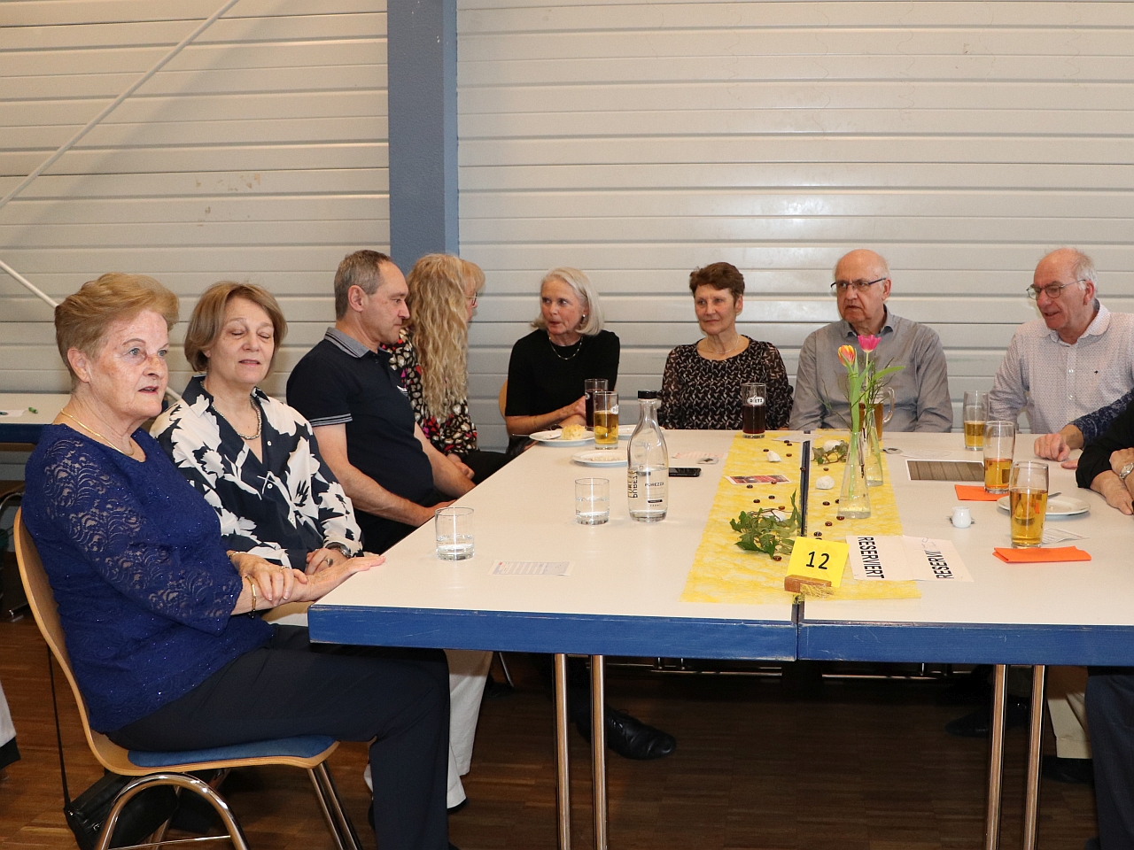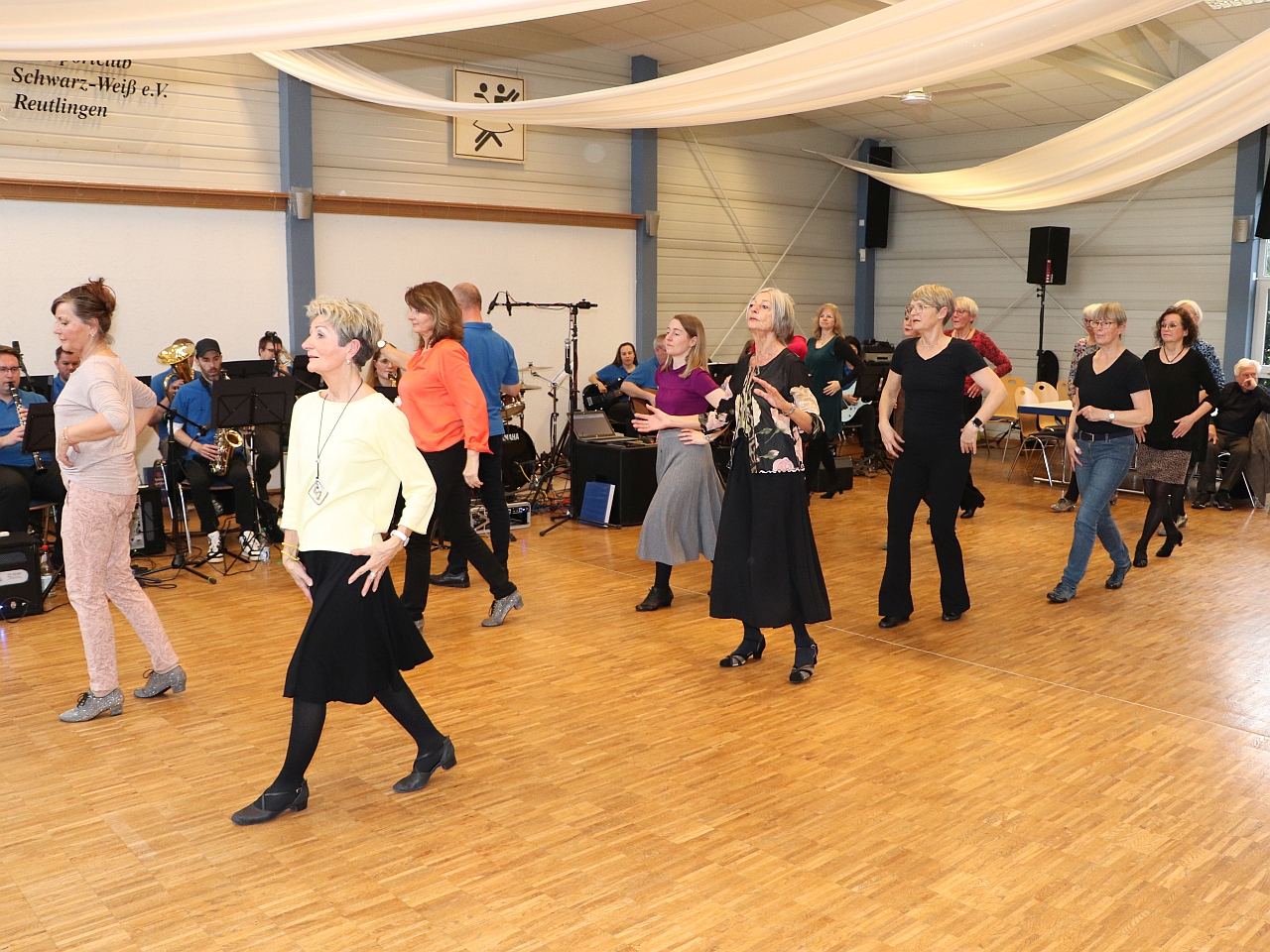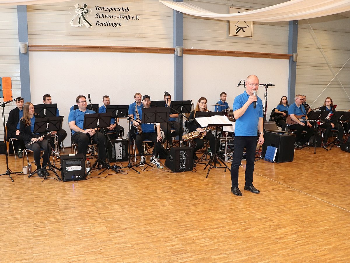 Apropos Musik: Gert Kürner, der Orchesterleiter, muss dieses Mal mit reduzierter Mannschaft auskommen. Musizieren sonst üblicherweise 21 Musikanten, sind es dieses Mal nur 16. Das tut jedoch weder der Spielfreude noch der Qualität in irgendeiner Weise Abbruch. Im Gegenteil, die verbleibenden Instrumentalisten geben alles. Und wer sich auskennt, der weiß: Hier erbringen sie vollen Einsatz und Höchstleistung. Denn 2 ½ Stunden Musik zu machen, das ist richtig Arbeit! Trotzdem begnügen sie sich mit nur kurzen Spielpausen und tragen ihr vielseitiges Repertoire an Tanzmusik leidenschaftlich vor.