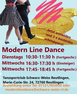 Ab dem 19.11.2025 gilt eine neue Anfangszeit für das Training der Anfängergruppe Modern Line Dance: Nun 16:30 Uhr statt wie bisher 16:45 Uhr.